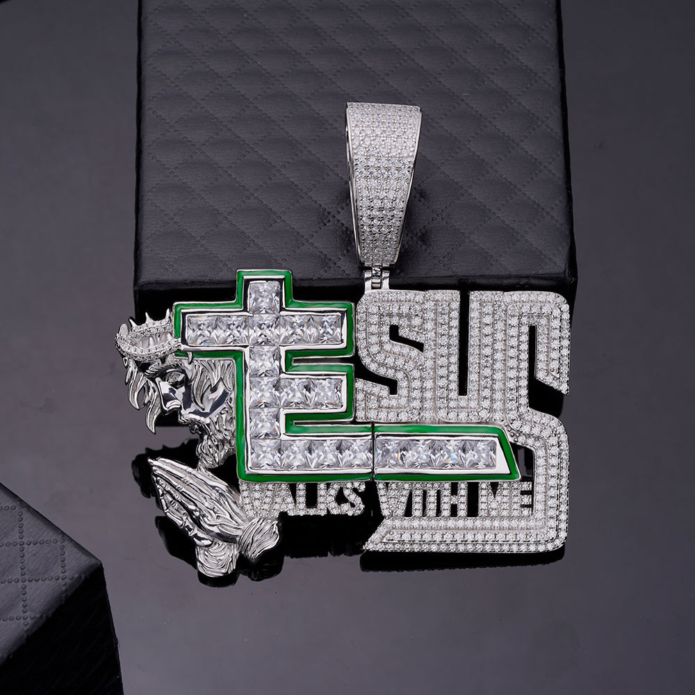 RELIGIO; ”God is most glorified in us when we are most satisfied in Him”. This coruscant, glow in the dark brass pendant is designed to do just the work for a true believer. Portrayed all over with CZ stones in ‘Jesus walks with me’ setting, and an astounding design, you can now honor your belief with a nudge of shine and flair.