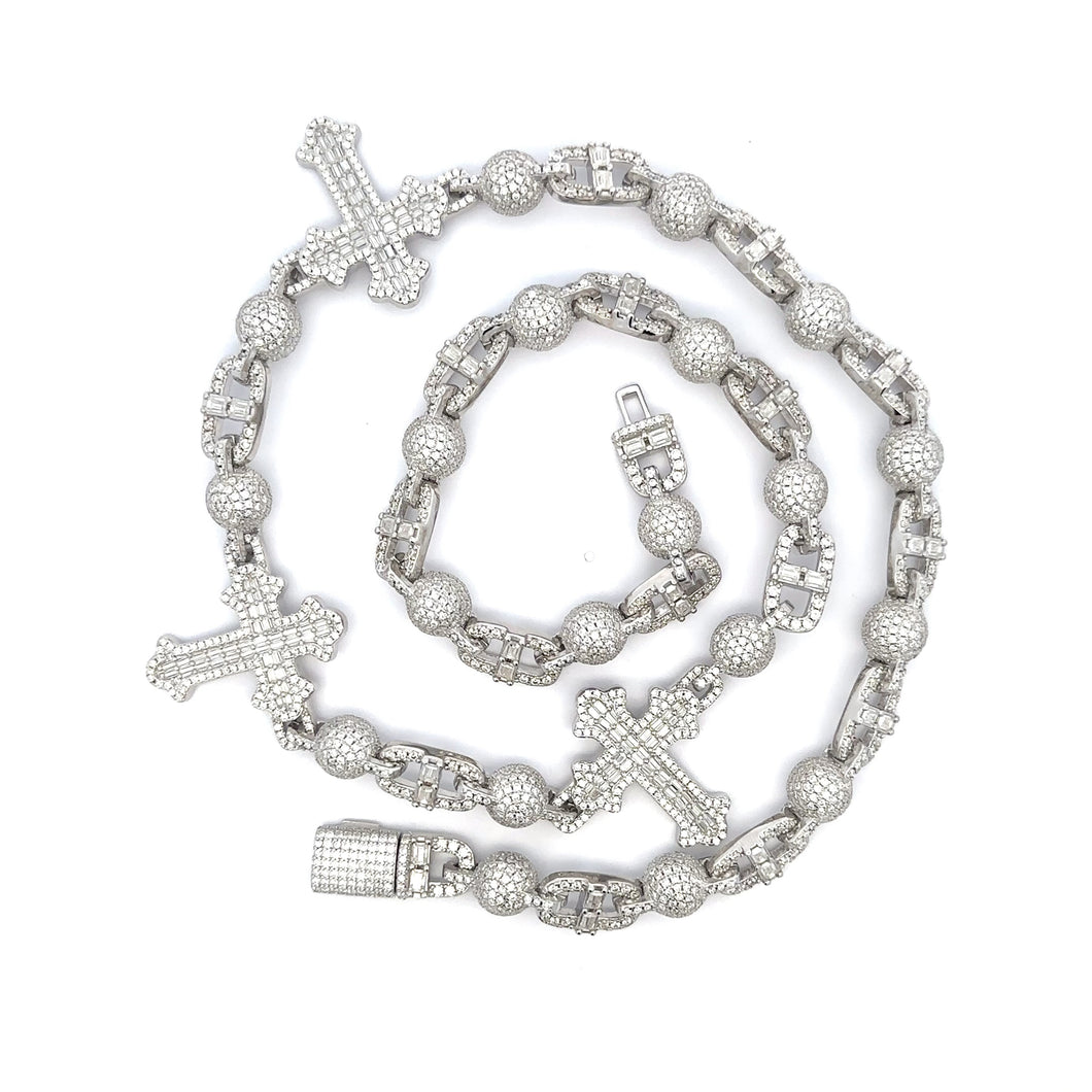 SYLVAN; This Rhodium Moissanite Iced Out Chain exudes luxury and elegance, perfect for making a bold fashion statement. Its rhodium coating ensures a brilliant, tarnish-resistant shine, while CZ stones provide unmatched sparkle and durability. This chain complements both casual and formal attire, adding a touch of sophistication to any outfit. Ideal for those who appreciate fine jewelry, it offers a stunning alternative to traditional diamonds.
