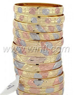 One Dozen bangle package, solid micron plating, Made in India, diamond cut patterns on the bangles, made to last plating and solid construction for an affordable price. Available in Gold, Silver and Tri-Gold combination. 7mm Width