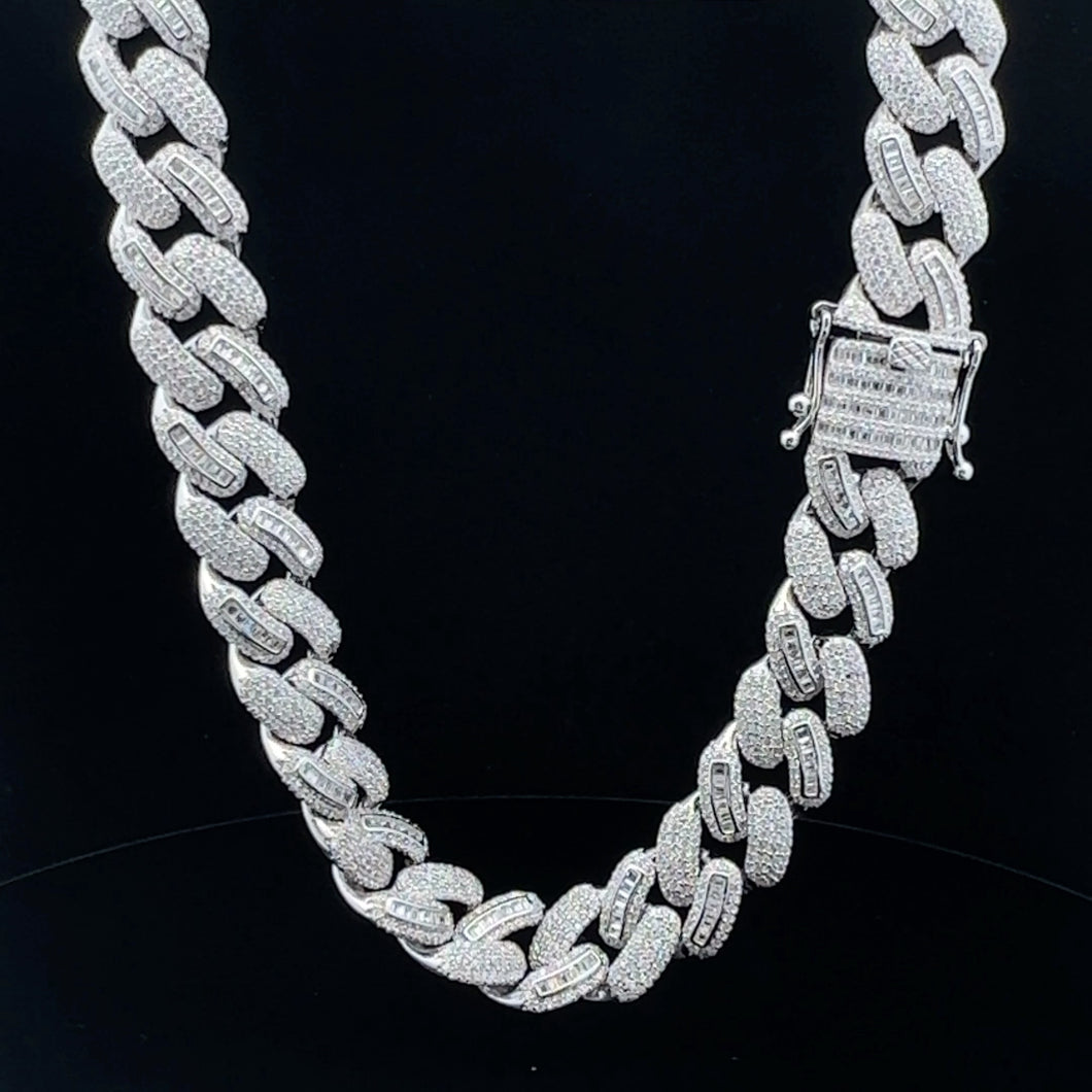 ENIGMAFROST; This 925 CZ Rhodium Iced Out Cuban Chain is a statement of sophistication and style. Featuring a dazzling CZ-encrusted Cuban chain in premium rhodium-plated silver, it exudes luxury. Perfect for elevating any ensemble, it adds a touch of opulence to both casual and formal attire. With its durable construction and eye-catching design, this chain offers timeless elegance and versatility. Make a bold fashion statement with this Cuban Chain, a must-have accessory for the fashion-forward individual.