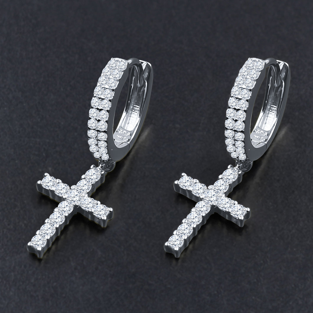 FULGENT; You're not fully dressed until a pair of earrings add sparkle. Get these silver drop huggies in a very reasonable price. These earrings with a hanging cross design are adorned with moissanite stones. Don't miss out!