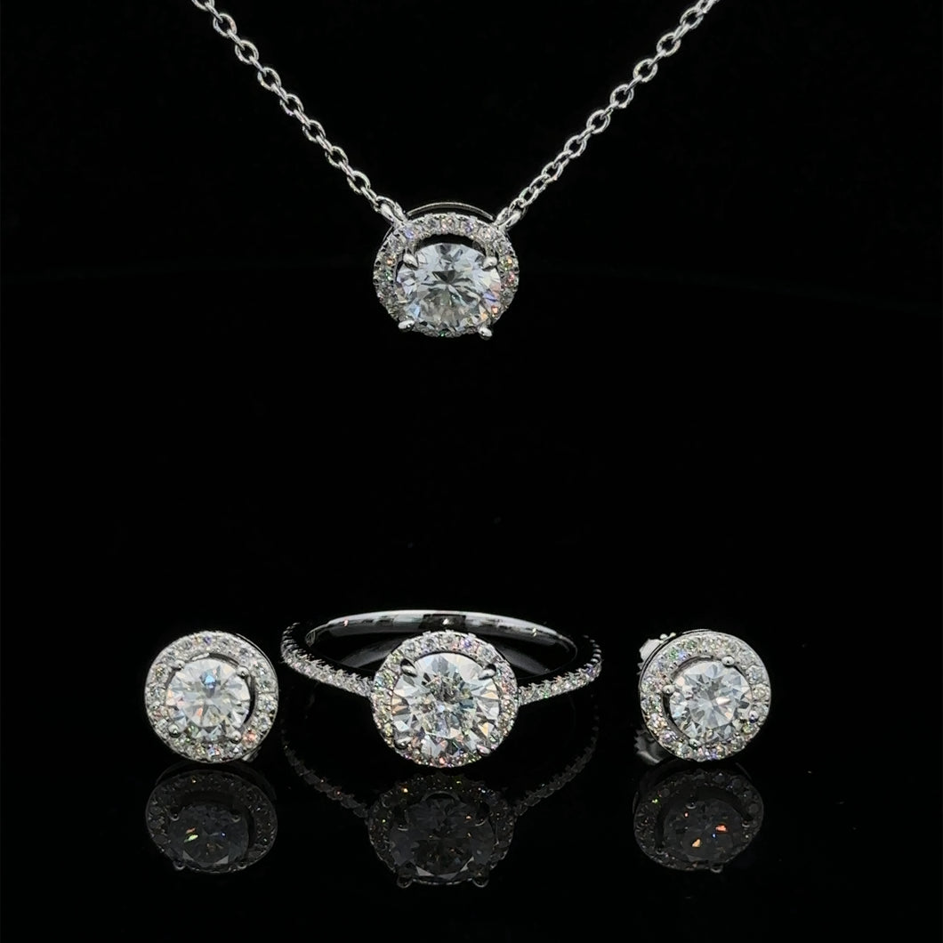 SPARKLING ENSEMBLE; This 925 Rhodium Round Moissanite Bundle Set is a dazzling addition to any jewelry collection. Crafted with precision and elegance, this set features radiant CZ stones in a stunning round cut, set in durable 925 sterling silver with a lustrous rhodium finish. Perfect for adding a touch of glamour to any outfit, this versatile set can be worn for special occasions or everyday elegance, offering timeless beauty and sophistication.