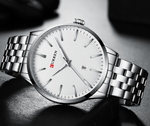 PAMOLA; This men's watch with Japanese quartz movement is the superlative selection for graceful and decent personalities. Simple yet catchy round dial nicely complimented with delicate pointers and Curren logo, is sure to make a splash wherever you go. Genuine stainless steel wristband gives this watch a refined finish. So don't be late, have a great style at a great price!