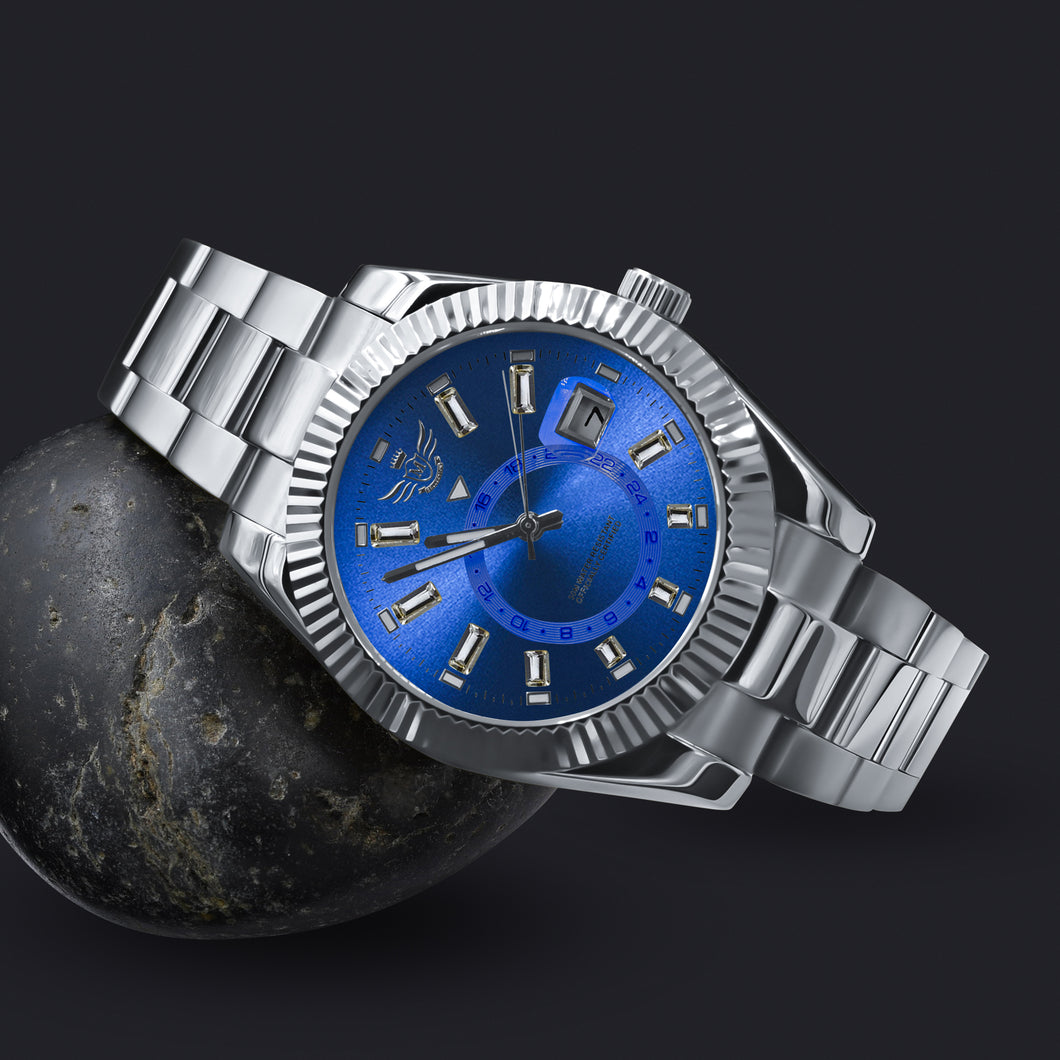 AIRSPACE ; Be the man of the hour & bling. This bedazzling exquisite watch set balances the sophistication of a dress watch with the soul of tomorrow's trendsetter. Paired with the blinging polished bracelet, this piece is indulged with individuality that distinguishes it from casuals. Grand & distinct, with a protuberant refulgent dial in the middle and coruscating layout style, this piece is sure  to be noticed whenever it's on your wrist.