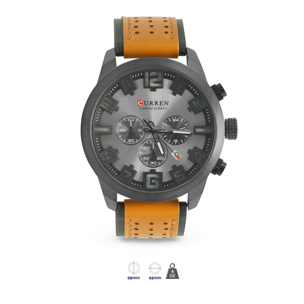 Curren branded classic leather watch with Japan Seiko Movement, Japan battery, Water Resitant, Stainless Steel Backcover, available in multiple colors and designs. Watch case is between 45-48mm and thickness of case is between 11-13mm.