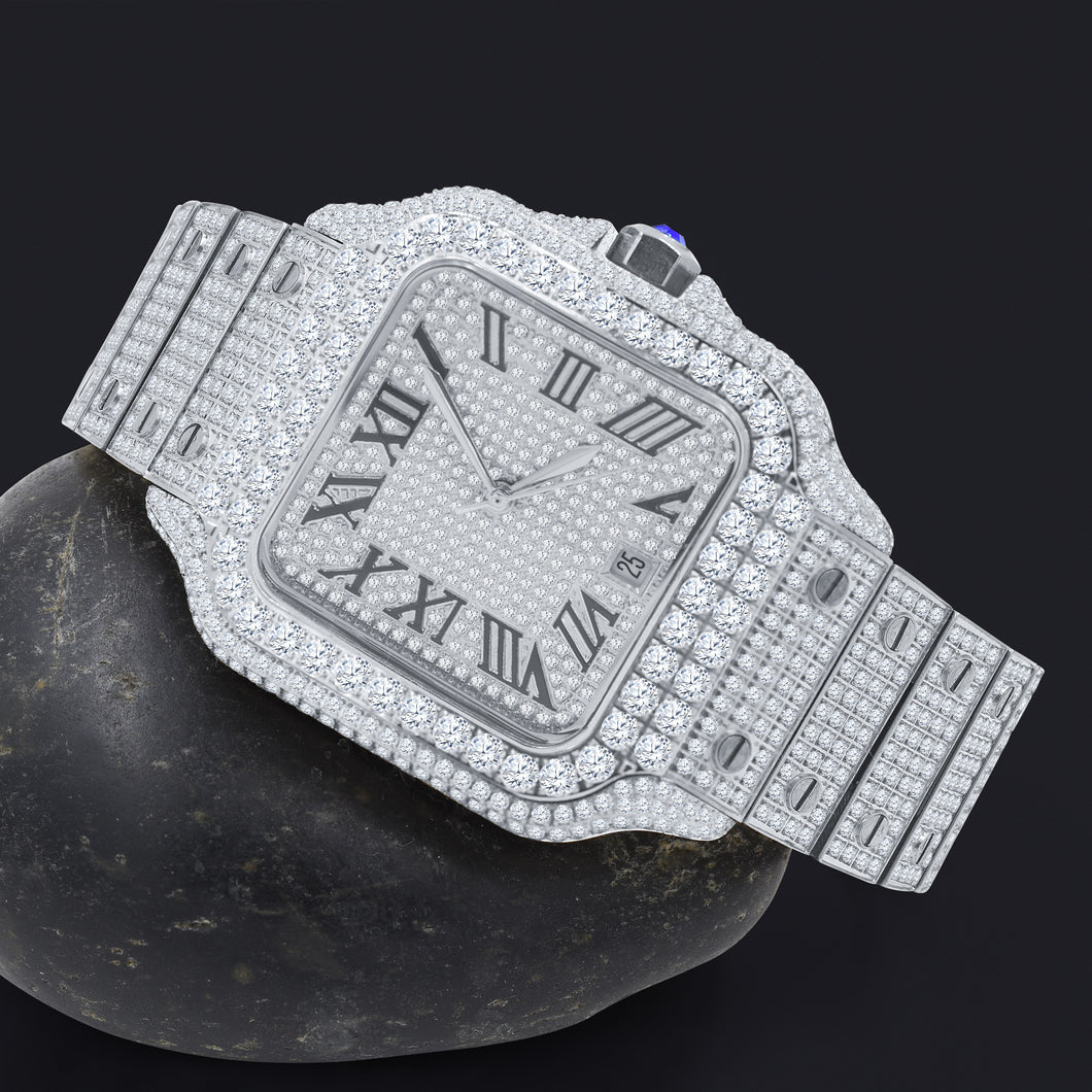 Time will change everything; just change your watch. This steel watch with quadrate dial featuring Roman hour markers is sure to make a statement. Decked with white moissanite stones, this time piece is going to be your perfect partner in the night-outs. Get your hands on it before it runs out of stock!
