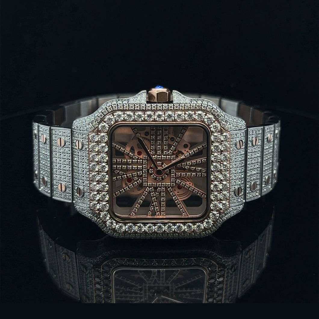 NEBULA; epitomizes resilience and style in the form of a Two Tone Rose Gold Steel Men's Timepiece. Versatile for any setting, it exudes sophistication and durability. The Two Tone design adds a touch of elegance, while the Moissanite stones provide subtle sparkle. Crafted with precision, it symbolizes both fashion and endurance for every occasion.