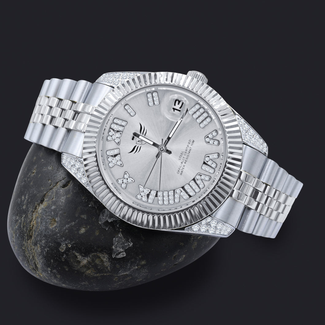 EARL; Assembled with great precision and fondness, this luxury quartz watch is assuredly for the gems with dauntless personality. The dial features a date-display window with striking Roman digits bearing minute crystal clear stones. The fancy lugs, aesthetic case and bezel with pronounced stainless steel strap get you on a move. Unveil your class and style with this affordable yet beautiful analog timepiece.