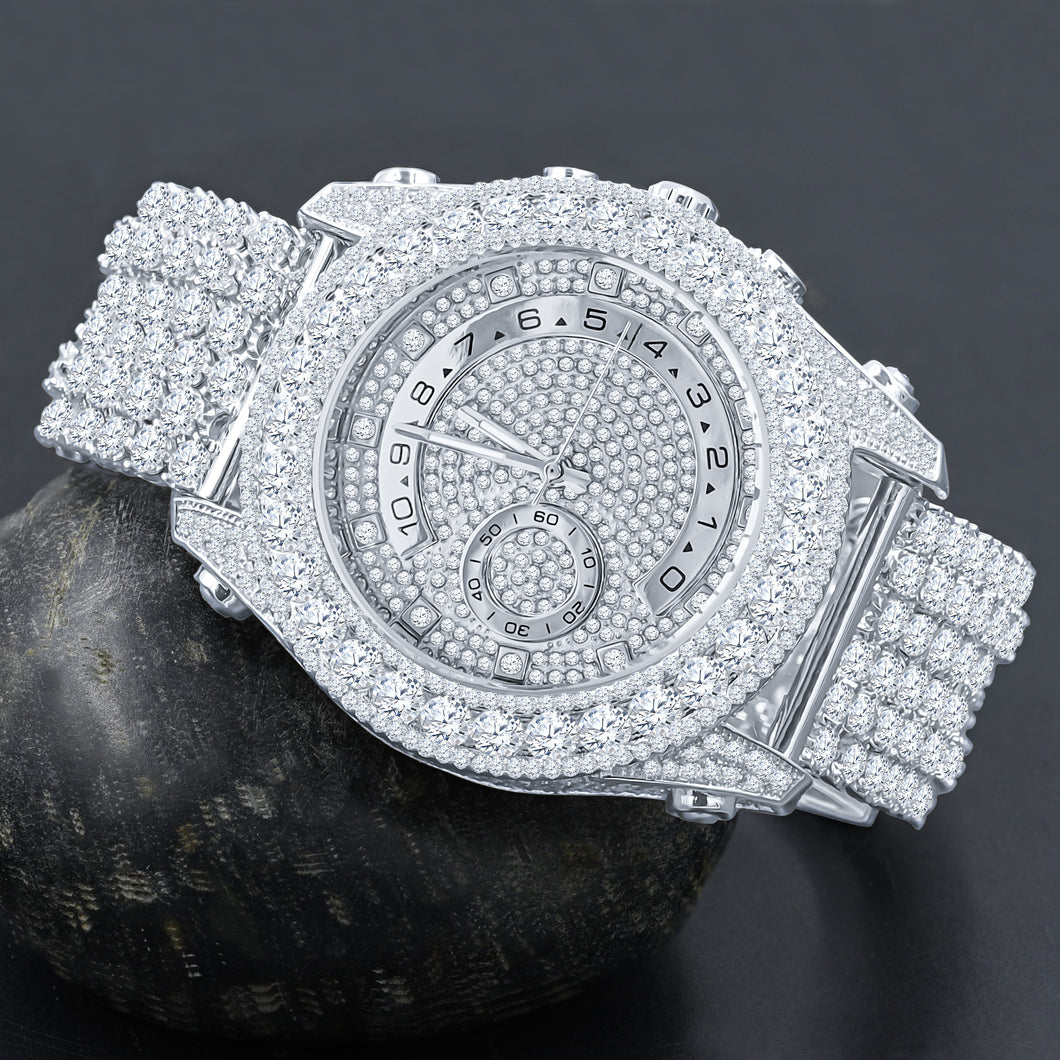 RADIEUX; This ostentatious watch is exceptionally emblazoned with cubic zirconia stones that glint like real diamonds. Fully iced bezel, lugs, metal strap and dial with stylish subdial are configured immaculately to take your breath away. This lavish timepiece is crafted from stainless steel for durable soundness and strength. Stay stiffen with this popular, trendy design which is all set to clutch your wrist blandly.