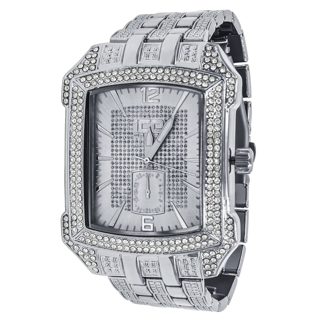 Icemaster Mens Silver on Silver Dial Crystal 2Row Bezel Rectangle faced watch