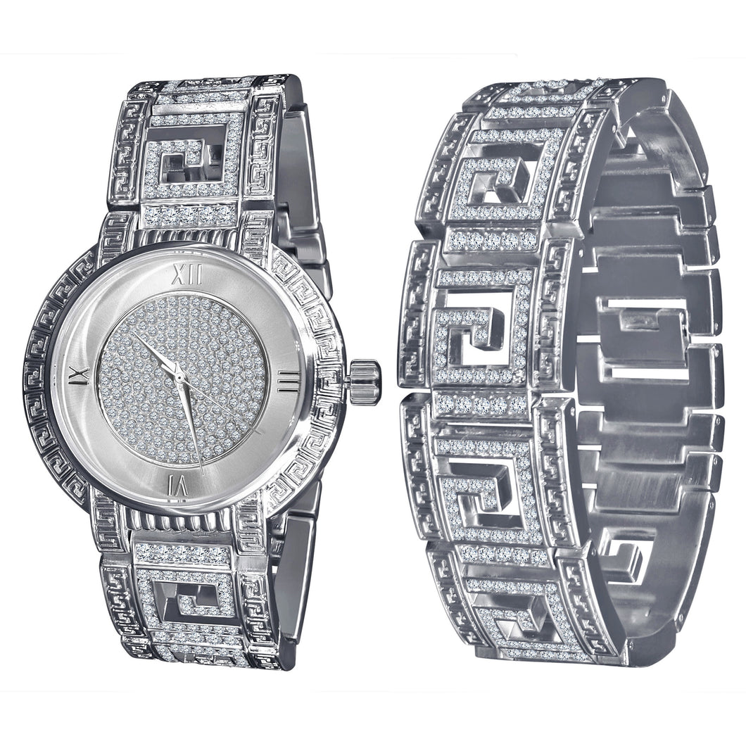 PALATIAL enjoys its own reputation boasting a greek key pattern on the entire watch, dial and bracelet studded with rhinestone crystals elevating the watch to a glamorous status. Enjoy with confidence the timepiece and its accompanying bracelet.