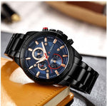 August curren's grade, elegance and functionality are perceptible in wordly bar of timepieces. This men's chronometer watch being water-repellent highlights a black dial accompanied by three unique subdials and leather strap. The aureate lugs and bezel alongwith protuberant hands give this timer a fancy finish.