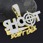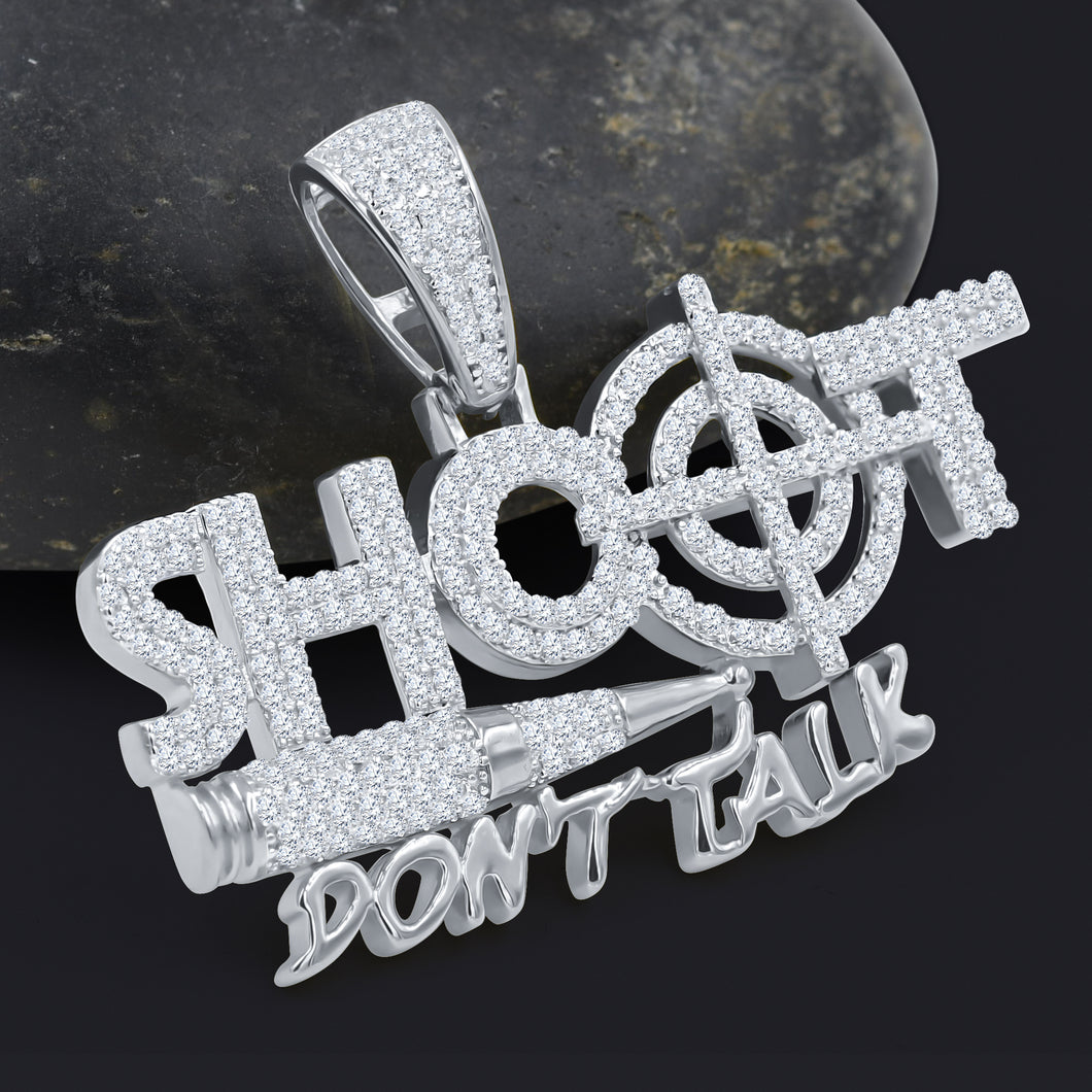 EMIT; The "Shoot, Don't Talk" sterling silver pendant is a statement piece of jewelry that embodies strength and resilience. The pendant features a powerful design that captures the essence of action and determination.