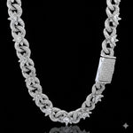 GLINT; This Rhodium Moissanite Iced Out Chain exudes luxury and elegance, perfect for making a bold fashion statement. Its rhodium coating ensures a brilliant, tarnish-resistant shine, while CZ stones provide unmatched sparkle and durability. This chain complements both casual and formal attire, adding a touch of sophistication to any outfit. Ideal for those who appreciate fine jewelry, it offers a stunning alternative to traditional diamonds.