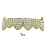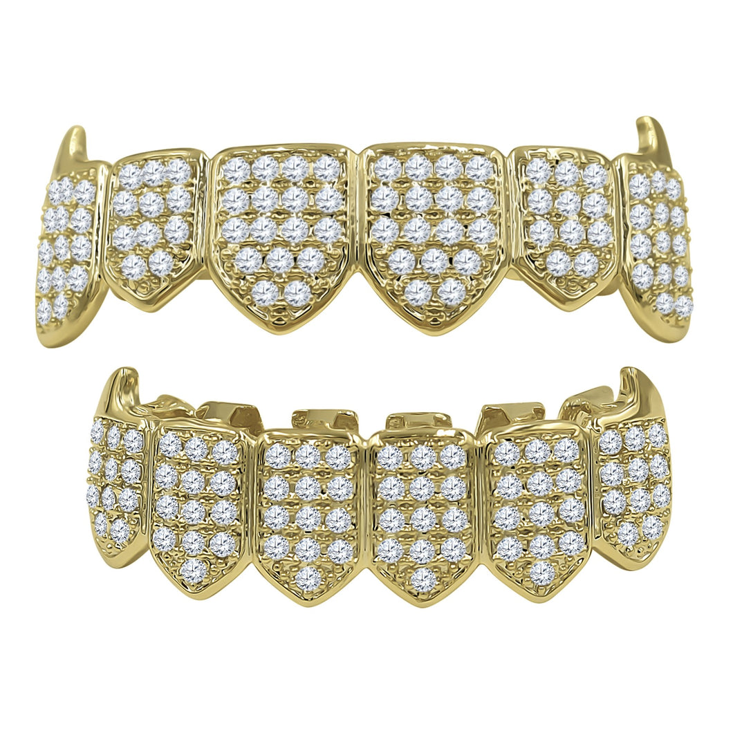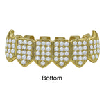 Wholesale Iced out Teeth Hip Hop Grillz at incredibly low wholesale prices available in Rhodium and Gold plating color in an acrylic box and wax/mold for one size fit all option. Solid construction and solid plating made for fashion use. Enjoy with confidence. Â