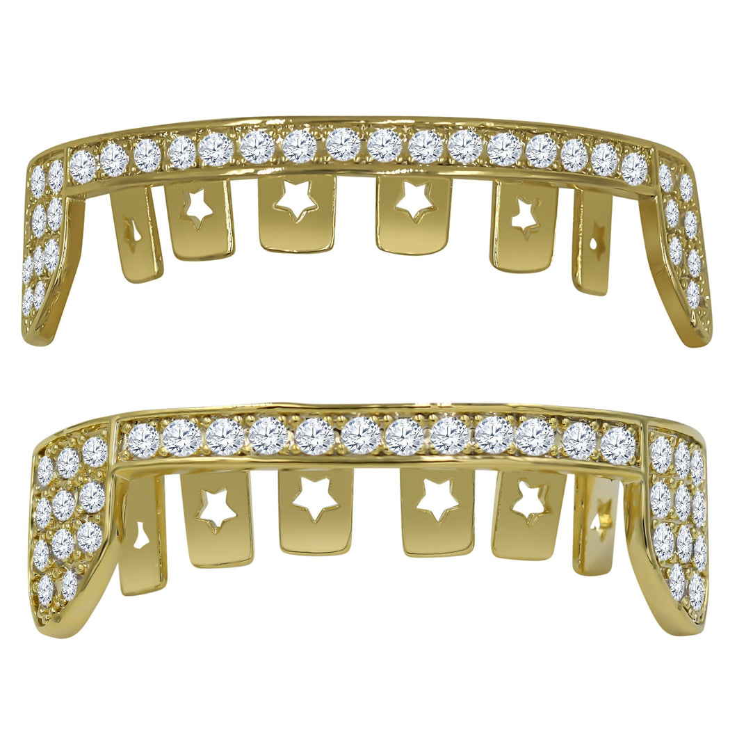 Wholesale Iced out Teeth Hip Hop Grillz at incredibly low wholesale prices available in Rhodium and Gold plating color in an acrylic box and wax/mold for one size fit all option. Solid construction and solid plating made for fashion use. Enjoy with confidence. Â