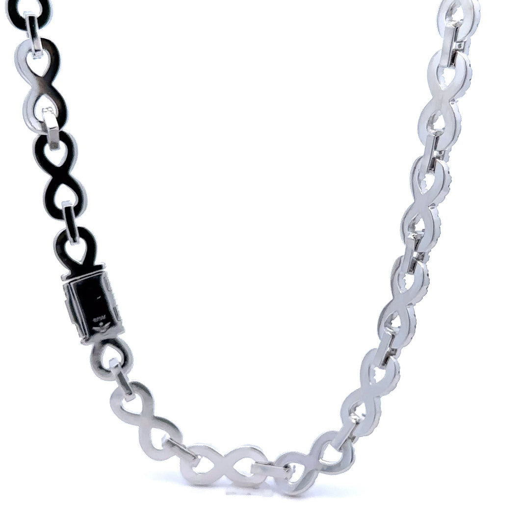 ICARUS; This Rhodium Moissanite Iced Out Chain exudes luxury and elegance, perfect for making a bold fashion statement. Its rhodium coating ensures a brilliant, tarnish-resistant shine, while CZ stones provide unmatched sparkle and durability. This chain complements both casual and formal attire, adding a touch of sophistication to any outfit. Ideal for those who appreciate fine jewelry, it offers a stunning alternative to traditional diamonds.