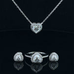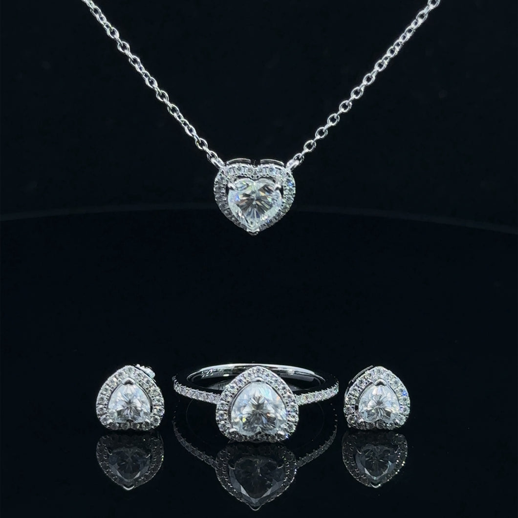 LUMINIQUE; This Rhodium Heart Shaped Moissanite Bundle offers timeless elegance and versatility. Crafted with precision, it includes a heart-shaped pendant and matching earrings, all adorned with shimmering CZ stones. Rhodium plating ensures lasting shine and durability. Perfect for adding a touch of glamour to any outfit, this bundle effortlessly transitions from day to night. Elevate your style with the enchanting beauty and unmatched brilliance of the Luminique 925 Rhodium Heart Shaped Moissanite Bundle.