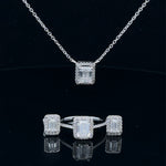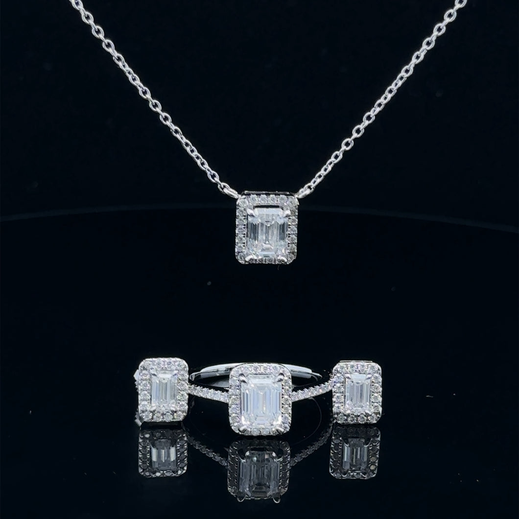 VERMILION; This Emerald Cut Moissanite Bundle offers sophistication and brilliance. Featuring a radiant emerald-cut CZ stone set in high-quality 925 rhodium-plated silver, it exudes elegance. Perfect for accessorizing formal attire or adding a touch of glamour to everyday wear. Its durable construction ensures longevity, while the moissanite's exceptional sparkle rivals that of diamonds. Elevate your style with this exquisite bundle, a timeless addition to any jewelry collection.
