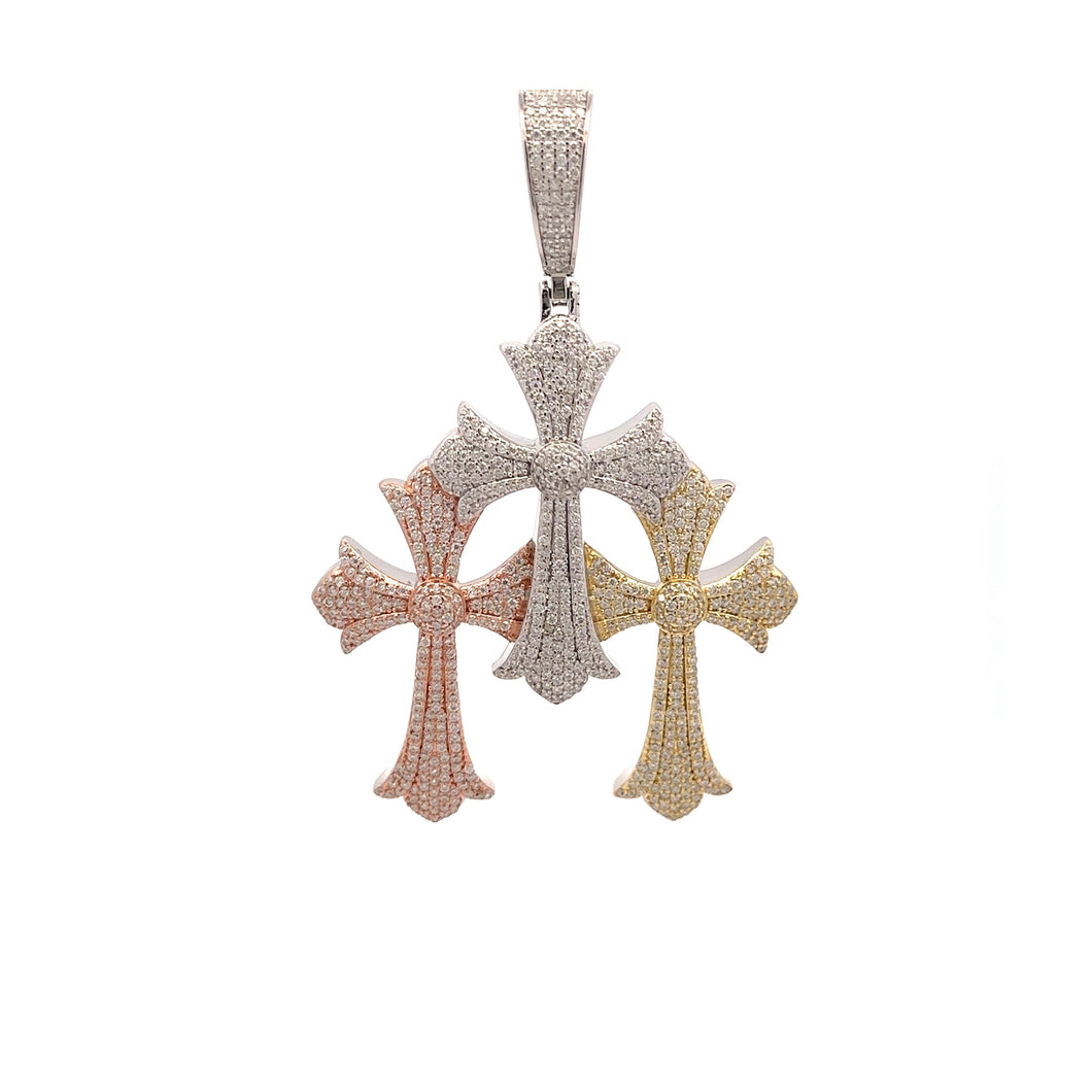 SORREL; This CZ TRI-Color Iced Out Pendant is a stylish accessory ideal for enhancing any outfit. Its rhodium rose gold plating ensures durability and resistance to tarnish, while the cubic zirconia stones offer brilliant sparkle and affordability. This pendant's elegance makes it perfect for special occasions or daily wear, providing a touch of luxury and sophistication without compromising on cost or quality.