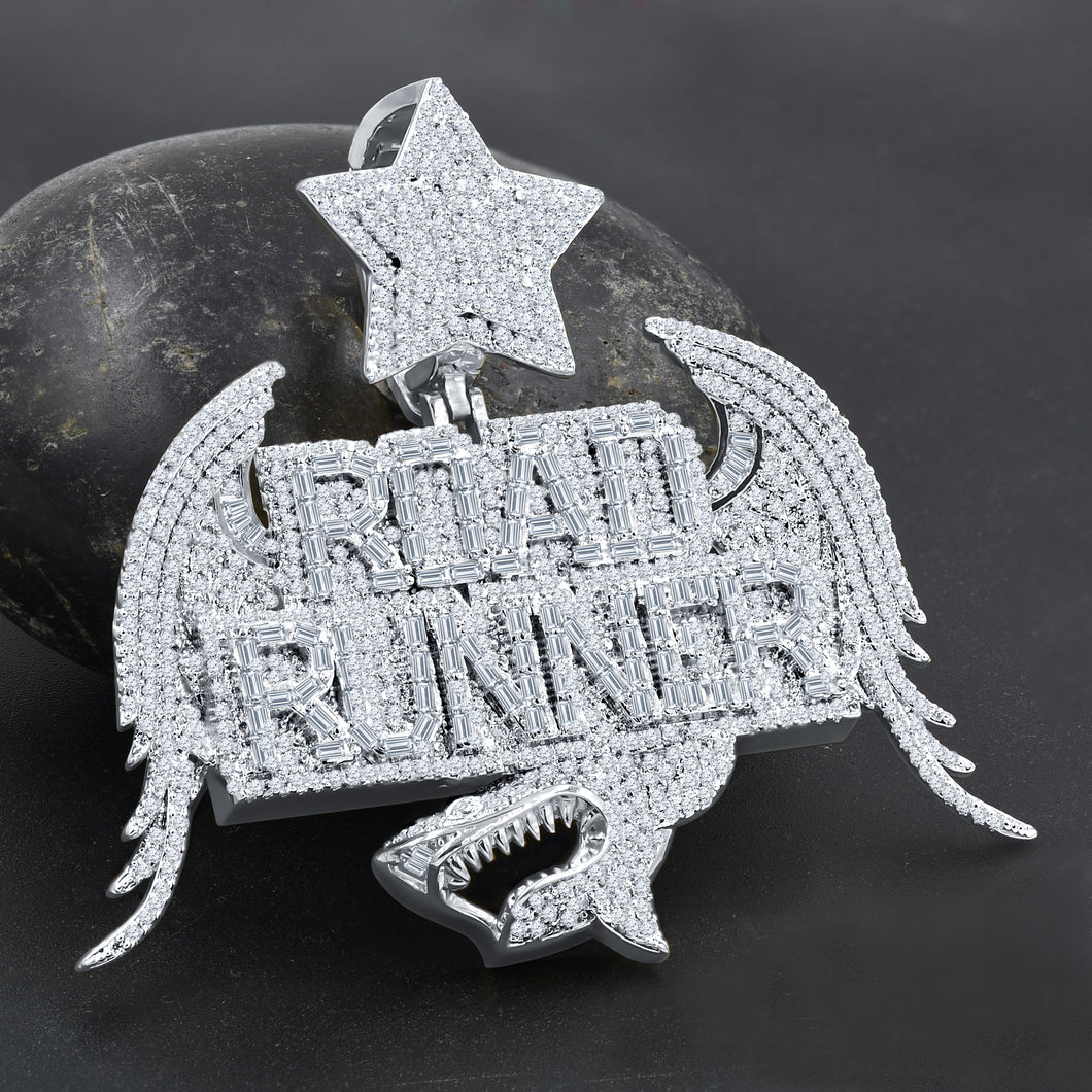 VAGOR; Don't feel sorry for yourself if you have chosen the wrong road. Turn around. Be on a ferocious fast drive with this road runner pendant, designed with funky flashy touch. Forged in a coruscant shape of wings in moissabite stones, this masterpiece sets you a road of self discovery.